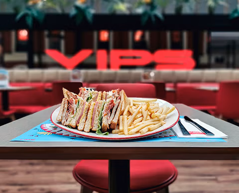 Entre los platos favoritos de sus clientes se encuentran las sabrosas ensaladas Louisiana o César, sandwiches como el popular VIPS Club o deliciosas hamburguesas como la Manhattan. Y para los más golosos, una amplia variedad de postres con lo que se te hará la boca agua.
